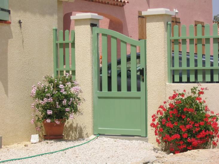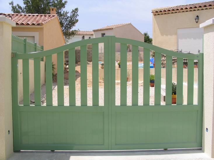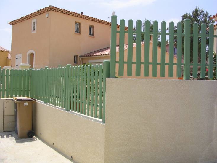 La Menuierie Calistri a posé dans une villa à Port de Bouc un portail en aluminium laqué vert, un portillon et une clôture de la même gamme Maine Clôtures.